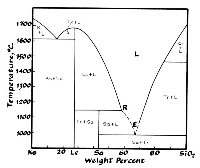 Use the kalsilite-quartz phase diagram below to answer the following questions.