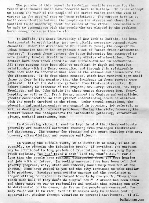 By this year, the Black population of Buffalo had risen to 100,000, yet only two hundred units of new housing had been built. Blacks were essentially stuffed into the small east side area. Riots rocked the East side of Buffalo from June 26th through July 1st of 1967, virtually shutting down the city. In one night (June 28th) of Violence over 40 people were hurt, 14 with gunshot wounds. Preliminary Report on the Disturbances in Buffalo June 26 -July 1. 1967 Click on the pages to read. |