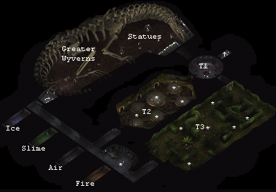 that can disarm the formidable trap that guards that route. In the large room with the wyrm remains at the far western point of this level are three formidable greater wyverns. A skeleton located near the northeast portion of this room will inform you that you can gain the assistance of five heroes to help you slay the wyverns. The heroes will collectively be able to dispatch the wyverns without your help, but you might want to send them up against the last wyvern one at a time, so that you won't have to fight the heroes yourself after the wyverns are all dead. The last wyvern may kill off all of the heroes, but it'll be so badly damaged that you should be able to take it out easily. Retreat through the narrow passageway at the southwest end of the room if you want to get away from any wyverns. The heroes are equipped with a long sword +1, a scroll of infravision and arrows of ice. The skeletons in the room southwest of the entrance to this level are equipped with acid arrows, arrows of fire, arrows of ice, arrows of dispelling, potions of healing, bullets +2, bolts +1. There are traps on some of the gangways to the platforms that the skeletons are perched upon. Once you've defeated all of the elemental rooms, you'll immediately be transferred to the chess room. The hardest of the rooms to defeat is fire while the easiest is ice, I suggest doing ice last. ice: The northernmost of the four elemental "test" rooms is the cold room, manned by winter wolves and Kaldrun the Bear (who, like the wolves, is capable of launching a ranged frost attack). Sending a few fireballs at the bear as soon as you enter the room will end the battle in a hurry. slime: The room immediately south of the previous one is the "slime" room, where a fission slime awaits. Make sure you use fire to take out the slime or you'll just cause it to multiply. air: In the next room south you'll initially be confronted by an air aspect, which looks like a baby wyvern but is considerably more vicious. Advance slowly into this room and take out the air aspect. Once it's gone, cast detect invisibility and continue advancing slowly through the room. There are three invisible stalkers in the room, but you can take them on one at a time if you advance slowly. With capable missile weapons, you'll be able to strike each of them down before they can reach your party. fire: The last room, the farthest one south, contains a phoenix guard, who you should take out with missile weapons. Do not use fire weapons or he'll multiply. He'll explode into a fireball when you take him out, and may return, forcing you to take him out again. chess: Obey the rules given at the beginning of the chess game to spare your party some pain. It's easiest to not move your party members at all, so you don't have to risk breaking the rules. Launch area-of-effect spells such as fireball, stinking cloud (the best) and web while you pick off enemies with missile weapons. The Queen is a dangerous spellcaster, so focus your attacks on her once she makes an appearance. Don't let any of the pawns reach your end of the board, where they can be transformed into Queens. The king is equipped with darts of stunning, a potion of frost-giant strength, scrolls of emotion, champion's strength, protection from evil ten-foot radius, remove curse and a two-handed sword +3: 'the world's edge', and the rooks are equipped with arrows +2. Once all of the enemy pieces have been dispatched, you don't have to worry about the rules and can walk through the room normally. Further, you can save and rest then without fear. The exit to the fourth floor is to the east. Here is another tactic I used to beat the chess room. Used my wizard to cast web on the middle right of the board. This stopped them almost completely. I then used my archer to target the farthest enemy they could with arrows of detonation. While I pounded the helpless victim I used basic monster summoning and summon skeletons to handle the 2 people who actually made it across the board. The summoned creatures were free to move anywhere. The rest of my party had missile weapons to help with the closer targets. The battle went quickly and when they were all dead you are free to walk right across the board, save and rest without fear. |
